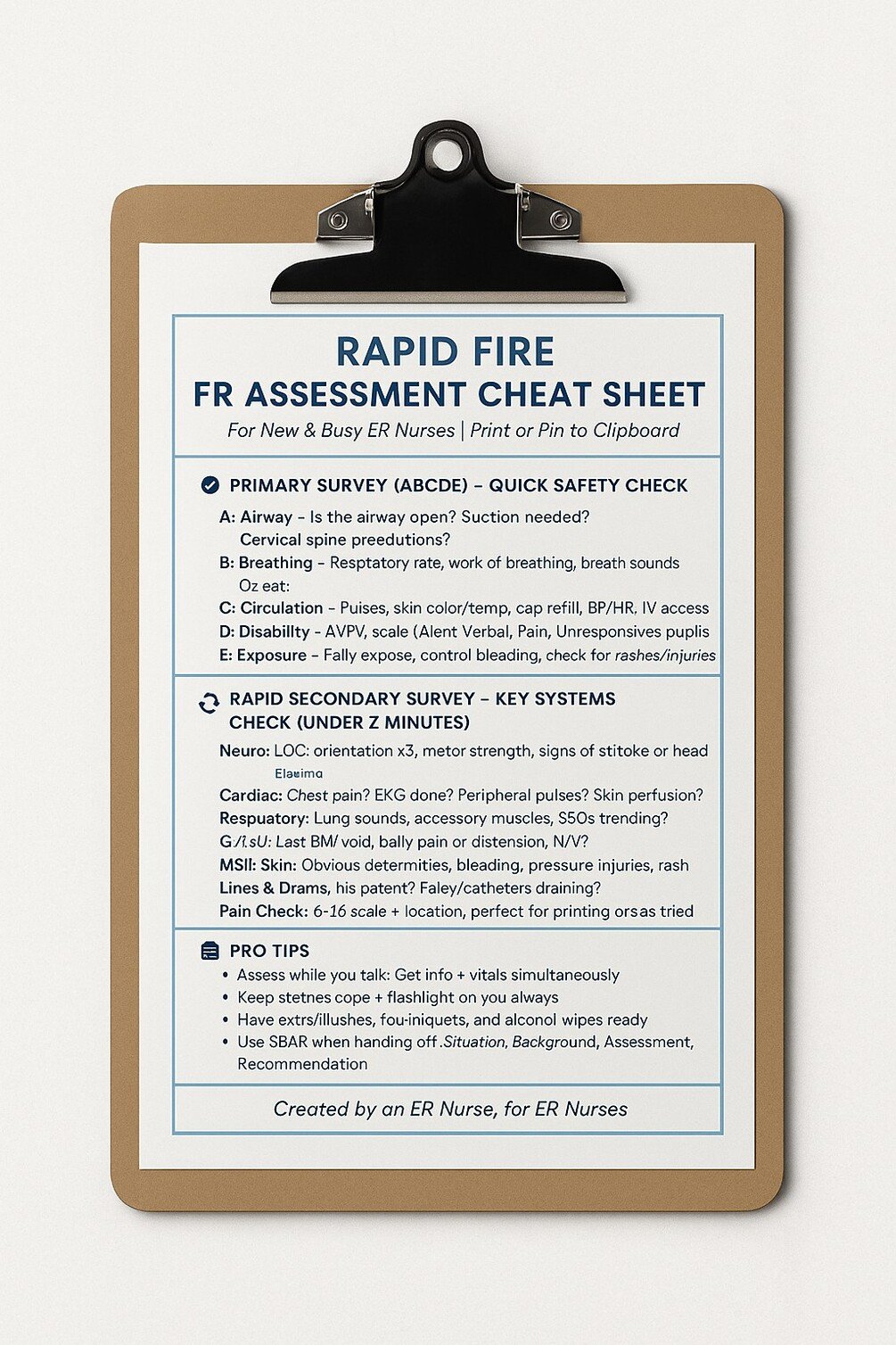 This printable one-page Rapid Fire ER Assessment Cheat Sheet is the ultimate timesaver for shift handoffs, new nurses, or anyone looking to streamline patient assessments in fast-paced environments.